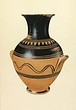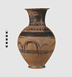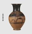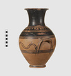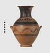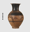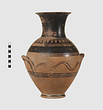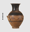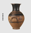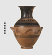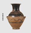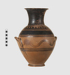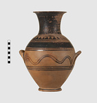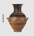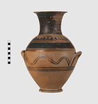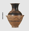 Description:   Ring foot and upwards tilted horizontal handles. Narrow neck flaring to lip. Bottom broken out. Metallic black glaze for band around foot, triple band below handle zone, bands on handles, shoulder and neck. Triple reserved bands above and below; tooth pattern on shoulder.