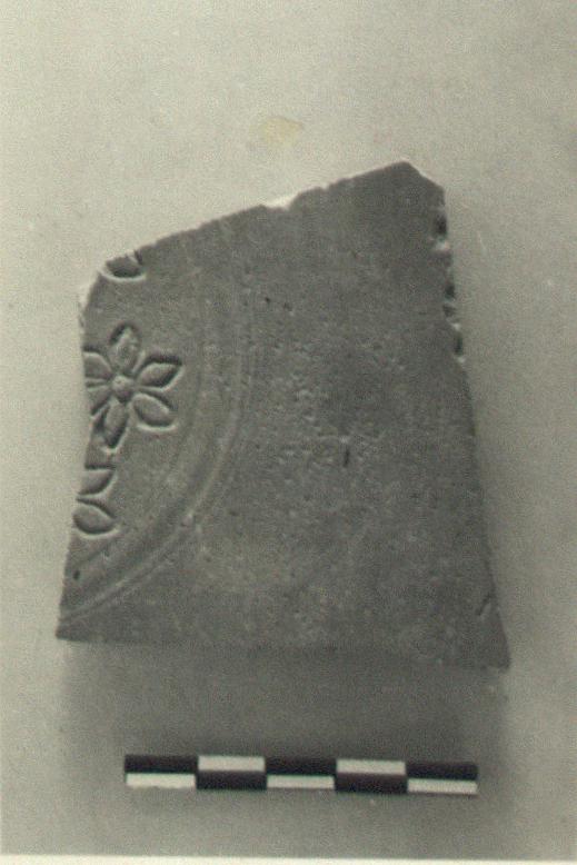 | Description: | Fragment near center of plate. Broken all around. Border of six-petalled flowers stamped all around center; grooves outside. Light red clay, red glaze. Late Roman B. | |