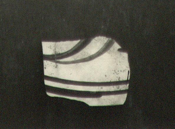 | Description: | Fragment from shoulder. Hard white slip on the shoulder decorated with yellow lines as border, with traces of a garland(?) above. At the turn of the shoulder, a deep brown-black band. Light red micaceous clay. Unpainted inside. | |