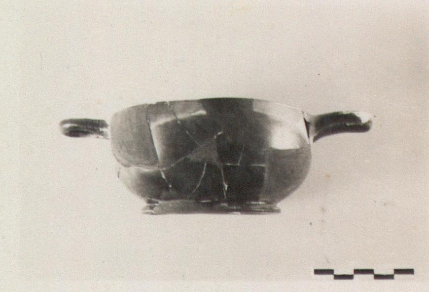 | Description: | Fragments missing from side. Crisp angular base ring; wall gently inturned; straight-sided handles. On underside, dot and ring pattern; floor plain. Glaze mottled black and red. | |