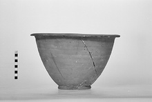 | Description: | About half preserved; no handles. Ring foot and flat outward projecting rim. Pink clay with white grits; thin streaky brownish glaze inside and on upper face of rim only. | |