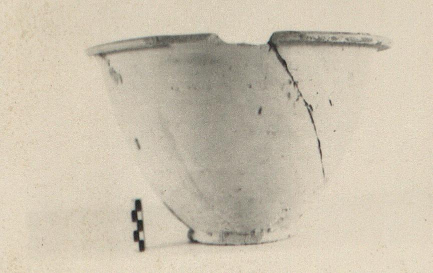 | Description: | About half preserved; no handles. Ring foot and flat outward projecting rim. Pink clay with white grits; thin streaky brownish glaze inside and on upper face of rim only. | |