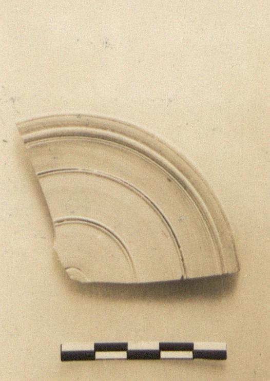 | Description: | [Originally identified as lid fragment. Now base fragment of a beaker] About one-fourth preserved. Small flat circular lid with downturned rim (broken away) and raised rings on its upper surface. Fine thin fabric like Roman A; red clay and glaze. Cf. P 6589, P 14619. | |