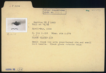 | Description: | Small round lid with downturned rim and small knob handle. Black glaze outside only. | |