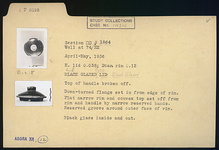 | Description: | Top of handle broken off. Downturned flange set in from edge of rim. Flat narrow rim and convex top set off from rim and handle by narrow reserved bands. Reserved groove around outer face of rim. Black glaze inside and out. | |