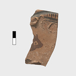 | Description: | From a pyxis lid, with a raised disk at the center, on which stood plastic horses (four footprints of one preserved). In reserved space under horse, part of a fish drawn in outline. | |