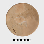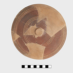| Description: | Pyxis lid with handle broken off. Restored in plaster. Wide and narrow bands, and a ring of dots. Dull red glaze. | |
