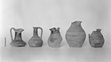 | Description: | Mouth, most of handle, and most of bottom missing. Restored in plaster. Concave bottom; squat body, lower and upper parts meeting at sharp angle; narrow upward-tapering neck. On body, bands; on neck, bands and linked dots; on handle, bars. Bluish glaze, somewhat peeled. | |