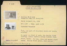 | Description: | Neck and part of shoulder; mouth and handle missing. In panel on front of neck, two facing birds feeding; double chevron column between them. Below, bands. On body, wide and narrow glaze bands. Bluish-black glaze, much peeled. | |