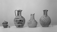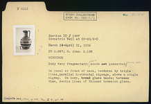 | Description: | Body very fragmentary; a bit of mouth preserved on one side. On panel at front of neck, bordered by triple lines, parallel horizontal zigzags, above a single zigzag. On body, broad glaze bands; between them, double lines of thinned brownish glaze. | |