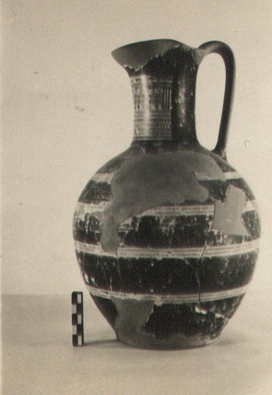 | Description: | Body very fragmentary; a bit of mouth preserved on one side. On panel at front of neck, bordered by triple lines, parallel horizontal zigzags, above a single zigzag. On body, broad glaze bands; between them, double lines of thinned brownish glaze. | |
