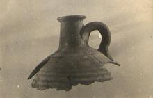 | Description: | Mouth, neck, handle and part of shoulder of a jug similar to P 8253 (ΠΘ 1928). Incised on shoulder, below handle: <graphic> ADDENDA P 8253: Outward stepped ring foot and elongated oval body, with shallow horizontal grooves; narrow neck, tapering slightly inward toward the mouth, and plain flaring rim; one vertical band handle, shoulder to middle of neck. | |