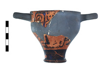 Description:   Three fragments, mended from several, give the base and part of the rim and wall; both handles are missing and there is no join between the wall and base fragments. Restored in plaster. Goblet-type skyphos. Beneath either handle a large palmette flanked by scrolls; on either side a cloaked figure, one holding a large oval object, right, the other left, largely indistinguishable. The resting surface reserved and the space inside the foot, with a large rough glaze circle near the center. Remains of heavy red wash.