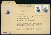 | Description: | Lip missing; body fragmentary. Restored in plaster. Ring foot and squat body; narrow neck and probably round flaring mouth. Vertical strap handle from shoulder to mouth. Thick fabric of gray clay; poor dull black glaze not reaching to the foot outside. | |