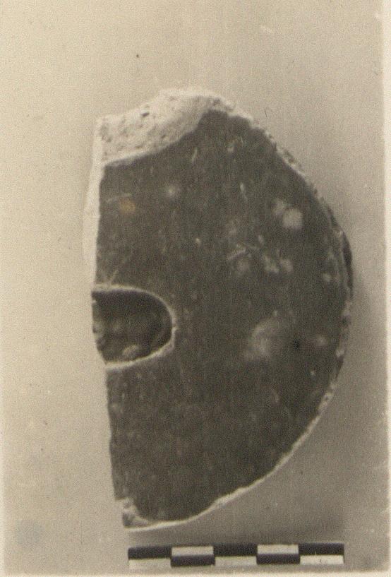 | Description: | About half the bottom of a flat-bottomed plate. Stamped at the center of the floor, a bull(?), left. Black glaze. | |