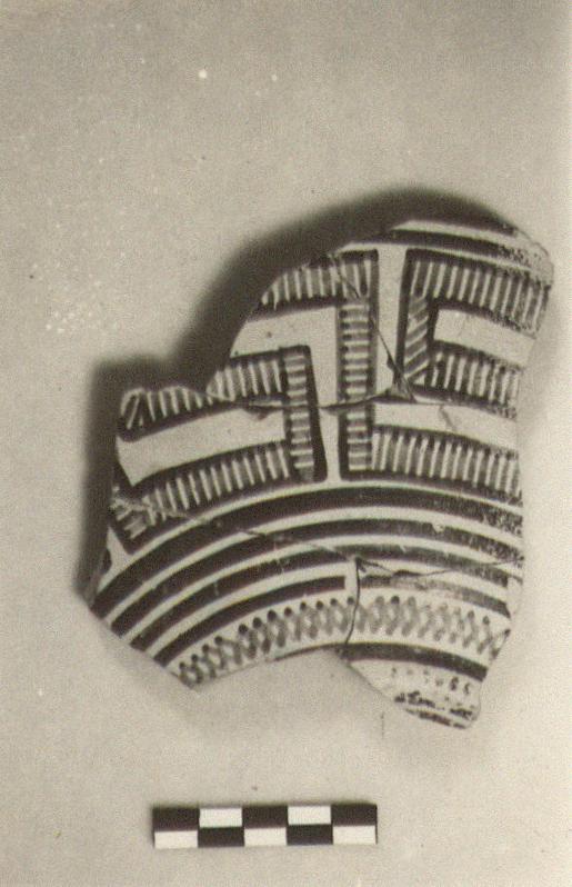 | Description: | Low flat base. Bands, lozenge chain, and hatched maeander outside. Brown to reddish glaze. | |
