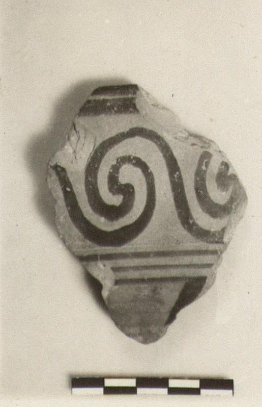 | Description: | Plain downward curved rim. On rim, a running spiral. Brownish glaze; inside not glazed. | |
