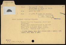 | Description: | Mended from two fragments; about half preserved. Small circular strainer, perforated with many small holes. Pinkish-buff clay. Glazed dull brownish-black on top; underside unglazed. Edges roughly finished. Handmade. A fairly common type that fitted into a kylix (cf. Athens, Nat.Mus. no. 154). | |