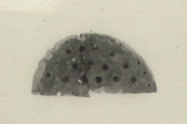 Description:   Mended from two fragments; about half preserved. Small circular strainer, perforated with many small holes.