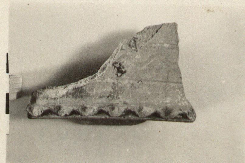 | Description: | Part of the sharply keeled rim. Piecrust fluting along lower edge of rim; incised on its outer face, a wavy line between straight horizontals. Micaceous red clay; handmade. | |