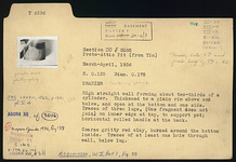 Description:   Restored in plaster. High straight wall forming about two-thirds of a cylinder. Thickened to a plain rim above and below, and open at the bottom and one side. Traces of three lugs (one fragment does not join) on inner edge at top, to support pot; horizontal rolled handle at the back.