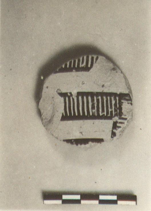 | Description: | Cut from an open pot glazed inside. Hatched plain maeander outside. | |