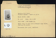 | Description: | Small ring of clay with straight edge below, flaring rim above. Pot stand? Micaceous pink clay, unglazed. | |