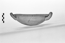 | Description: | Shallow round-bottomed body with projecting rim slightly flanged on inner edge; horizontal rolled handles. Restored in plaster. Pink clay with white grits, unglazed. ADDENDA Found broken [December 1956]. | |