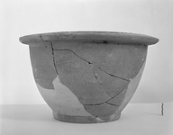 | Description: | Most of rim preserved, and much of walls; about one-third of base, mostly in non-joining fragment c). Fragments d)-g) non-joining, from walls and base. Restored in plaster. A large deep basin, with sides curving steeply up from a low sturdy foot ring. Heavy turned-over rim, fairly wide, moulded, with an incised wavy line between two grooves. Coarse, brownish-buff clay; inside and top of rim covered with a lustreless water-proofing, black to brown. Cf. P 9111, P 9114, P 4309. Cf. Agora XXXIII, no. 281. | |