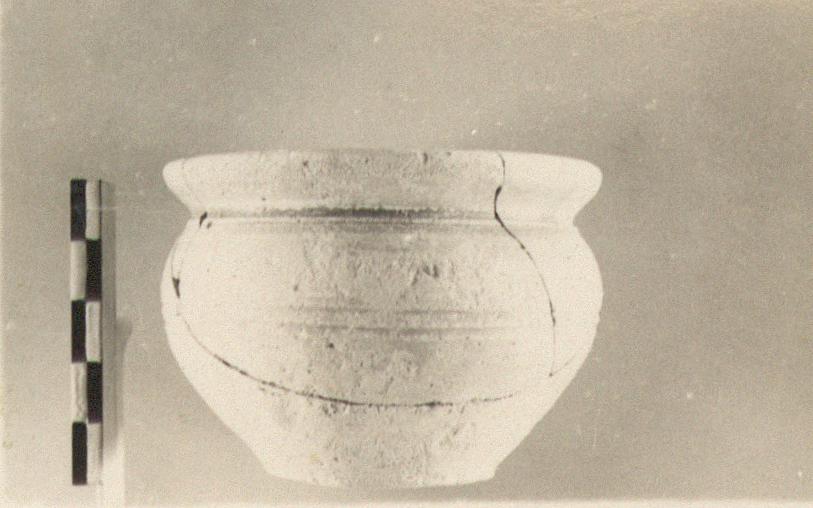 | Description: | Flat base; squat body, with medium-high shoulder marked by two horizontal grooves; low flaring rim, with plain lip, set off from body by a ridge. Clay deep buff at center, lighter at surfaces; yellowish-brown matte paint covers the inside, and the outside nearly down to the foot. | |