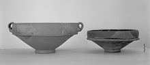 | Description: | Two non-joining fragments preserve perhaps one-third of the rim and some of the upper wall of a Late Roman D bowl. Restored in plaster. Keel is unusually marked for a bowl of this type; rim is slightly convex in profile with three wheel-run grooves just below lip, and one just above the keel. The familiar horizontal ribbed lug is elaborated by a broad vertical loop handle, with five ribs, which rises just below the horizontal handle, swings up a little above the rim, and is attached just below the lip. Coarse, pinkish-buff clay; dull glaze-paint, red on inside and upper side walls, brownish-yellow on rim; traces of spiral ornament on rim, in white. ADDENDA Four small non-joining fragments (c-f), including bits of keel and side walls, were originally connected to P 8496. But these fragments do not belong; from a smaller bowl; returned to Tin 171. Three fragments inside bowl - join? | |