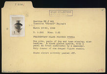 | Description: | One side, parts of top and base missing; also handles. A black glazed hydria, with a panel in front surmounted by a maeander. Only traces of one draped figure remain. Glaze almost entirely peeled off. | |