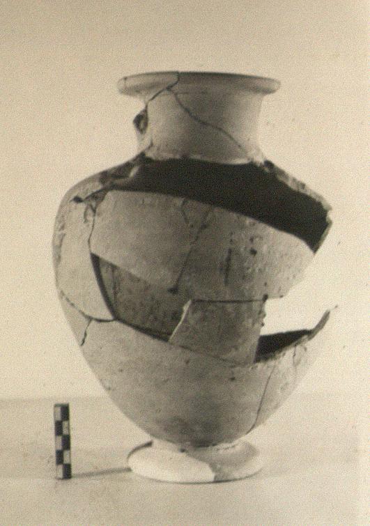| Description: | One side, parts of top and base missing; also handles. A black glazed hydria, with a panel in front surmounted by a maeander. Only traces of one draped figure remain. Glaze almost entirely peeled off. | |