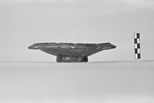 Description:   Half the ring foot and fragments from floor and rim missing. A slightly concave plate with a down-sloping rim which rises to a sharp ridge where it joins the floor.