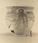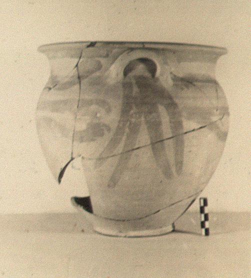 | Description: | One side missing. A deep jar on small ring foot; short neck; flat out-turned rim; small horizontal handles pressed against the neck. Pinkish-buff clay, decorated in dull red; below the rim, a straight band; on neck and shoulder three bands (wavy, straight, and wavy). Beneath the handles hang pendent red lines. | |
