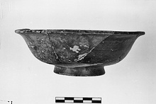 Description:   About half missing. Restored in plaster. Ring foot; outcurved rim.