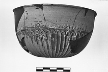 | Description: | Fragments missing from wall and rim. Restored in plaster. A simple long-petalled type bowl with ovolos above. Dull black glaze much worn, a little metallic inside. | |