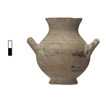 | Description: | Part of neck missing. Small ring base; globular body with short flaring neck; horizontal loop handles set at an angle to the body at the point of greatest diameter. Decorated with narrow bands and two heavy wavy lines. Light pinkish-buff clay. Chocolate-brown glaze, flaked. | |