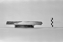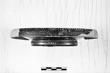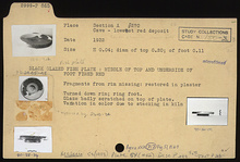 Description:   Fragments from rim missing; restored in plaster. Turned down rim; ring foot. Glaze badly scratched on top of plate. Middle of top and underside of foot fired red; variation in color due to stacking in kiln.