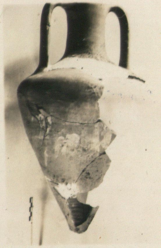 | Description: | Much of walls missing, and of base. Scratched and stained in lower part. Thumb marks at base of handle. Red clay, micaceous, well washed. The surface polished. ADDENDA Another amphora from this well, red, round-bodied, bottom missing, among unnumbered household pots. | |