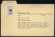 | Description: | From a plate(?) on a low ring foot. Inside, pair of feet right, with the end of a staff in front of them. Outside and inside, upturned wall, above foot, unglazed and finished with a fine polished surface; inside foot glazed. No relief contours. | |