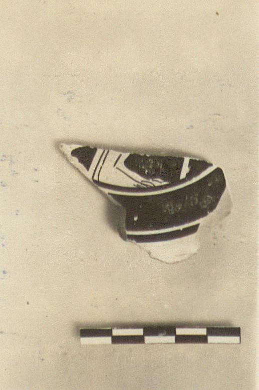 | Description: | From a plate(?) on a low ring foot. Inside, pair of feet right, with the end of a staff in front of them. Outside and inside, upturned wall, above foot, unglazed and finished with a fine polished surface; inside foot glazed. No relief contours. | |