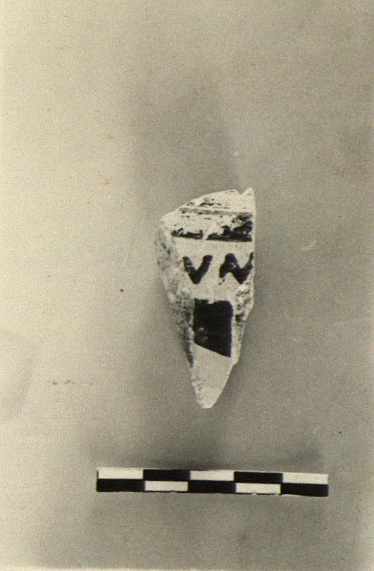 Description:   Broken all around. Fragment from near shoulder of a large open vase. Thin black glaze on interior. Outside, above, black with very narrow reserved line, then letters in black glaze (V N), then part of an arm(?).