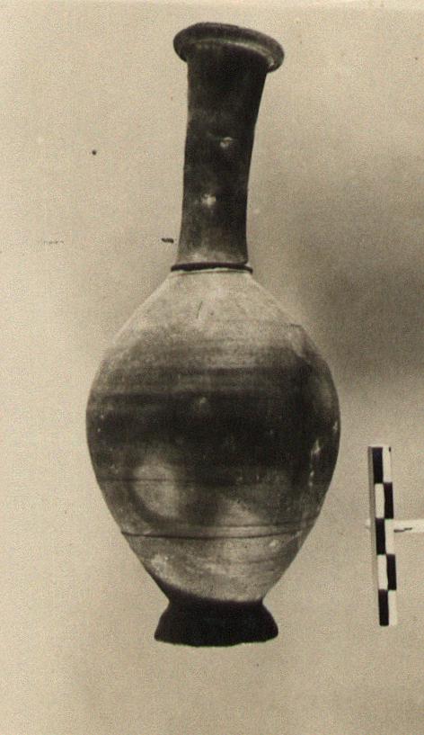 Description:   A large unguentarium similar to the ordinary fusiform type, but with a high flaring ring foot instead of the stem. A slight ridge between neck and shoulder.