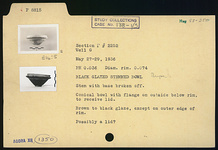 | Description: | Stem with base broken off. Conical bowl with flange on outside below rim, to receive lid. Brown to black glaze, except on outer edge of rim. Possibly a lid(?). | |