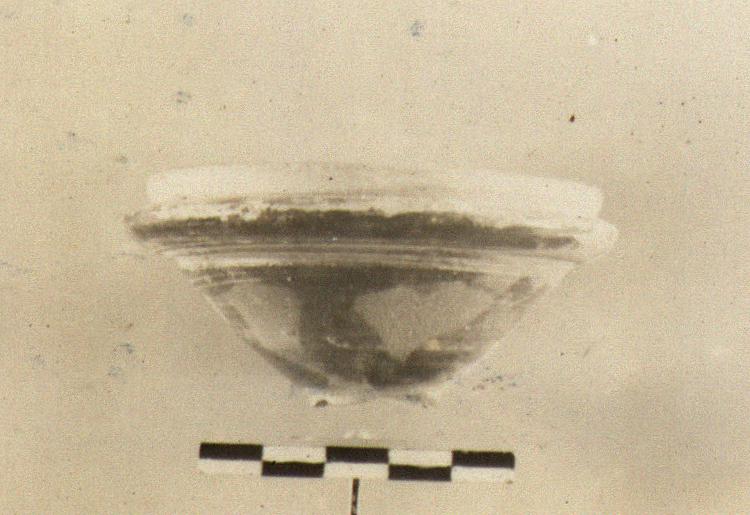 | Description: | Stem with base broken off. Conical bowl with flange on outside below rim, to receive lid. Brown to black glaze, except on outer edge of rim. Possibly a lid(?). | |