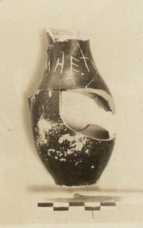 | Description: | Much of mouth and body and handle missing. Flat bottom. Elongated ovoid body, convex-concave contiguous with neck; flaring mouth. Handle, lip to point of greatest circumference. Restored in plaster. Pink clay; fine black glaze somewhat peeled. Incised just below neck: <graphic> Cf. ClRh III, p. 111. | |