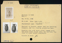 | Description: | Restored in plaster. Similar to P 8842 ff. Flaring projecting base. Purplish clay with white grits; creamy slip; two glaze bands around body; one low down, the other at lower handle attachment. Incised on neck: <graphic> ADDENDA P 8842: Flat bottom. Elongated ovoid body, convex-concave contiguous with neck; flaring mouth. Handle, lip to point of greatest circumference. | |