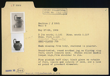 | Description: | Much missing from body; restored in plaster. Round-bodied, round-mouthed jug on flaring ring foot; short concave neck. Double rolled handle looped high, from shoulder to rim. Fine pinkish buff clay; black glaze on outside of foot, inside and outside of neck and a band at point of greatest circumference. | |