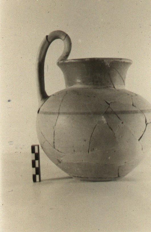 | Description: | Fragments of rim and body missing; restored in plaster. Similar to P 8865 (Γ 2302) in shape, fabric, and decoration, but slightly smaller and squatter and flat-bottomed. Reddish-brown glaze bands somewhat peeled. ADDENDA P 8865: Similar in shape, decoration and fabric to P 8864 (Γ 2301), but smaller and with strap handle, concave in section on its outer face. P 8864: Round-bodied, round-mouthed jug on flaring ring foot; short concave neck. Handle looped high, from shoulder to rim. Fine pinkish buff clay; black glaze on outside of foot, inside and outside of neck and a band at point of greatest circumference. | |